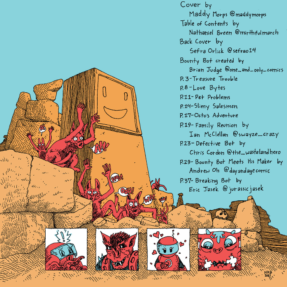 This book contains a series of short stories from various other indie comic artists, many of which are Xomik Buk alumni! Featuring the combined talents of Erik Jasek, Nathaniel Breen, Maddy Morps, Sefra Orlick, and Ian McClellan, BOUNTY BOT #1 is an action packed comic full of fun & adventure!